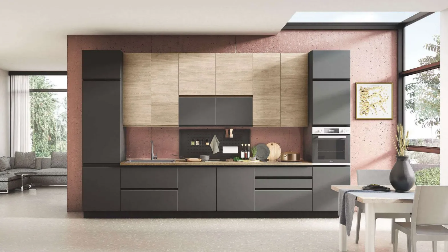 Le Cucine Moderne della marca Net Cucine hanno un generale equilibrio tra mood contemporaneo, ricerca tecnologica, funzionalità e creatività. Tra i molteplici modelli presenti nel catalogo Net Cucine, la cucina nella fotografia rende lo spazio facilmente fruibile e danno la possibilità di godere degli ambienti domestici appieno. Se desideri ordinare una soluzione in polimerico tra le diverse proposte in linea, l'alta componibilità della Cucina Moderna Kelly 05 Rovere caldo e Grigio Antracite opaco di Net Cucine ti darà modo di esprimere le tue esigenze d’arredo. Realizza con noi un progetto su misura: per vivere in pieno comfort la tua abitazione, i nostri arredatori sono pronti a guidarti con professionalità nell’acquisto.
